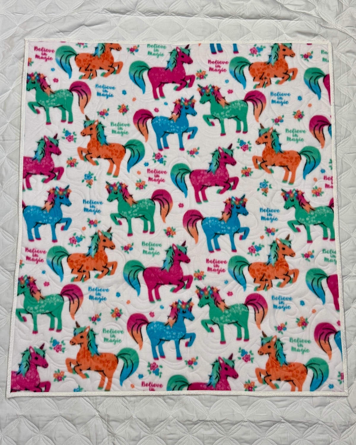 A cheerful blend of pink marble and whimsical unicorn prints, the Believe in Magic Quilt is full of playful charm. Framed with soft white and rose-pink borders on the front and backed with cozy flannel covered in colorful unicorns and the words “Believe in Magic,” this handmade quilt is perfect for dreamers who love color, comfort, and a touch of imagination.