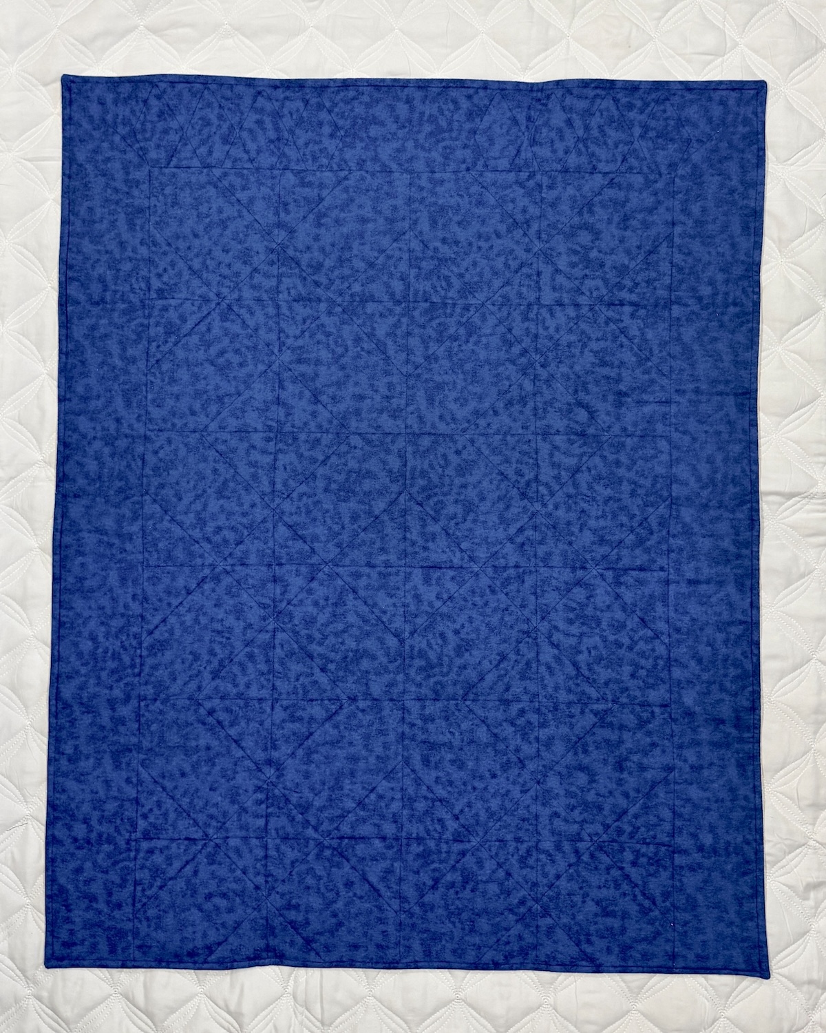 The Blessings in Blue Quilt features a beautiful combination of navy, cream, and soft peach tones arranged in a classic geometric pattern. Each square is pieced with delicate floral prints that give it timeless elegance. A stitched message reading “Children are a gift from the Lord” adds a heartfelt touch to the design. The back is finished in a rich, deep blue fabric that complements the front perfectly, creating a cozy and meaningful handmade keepsake.