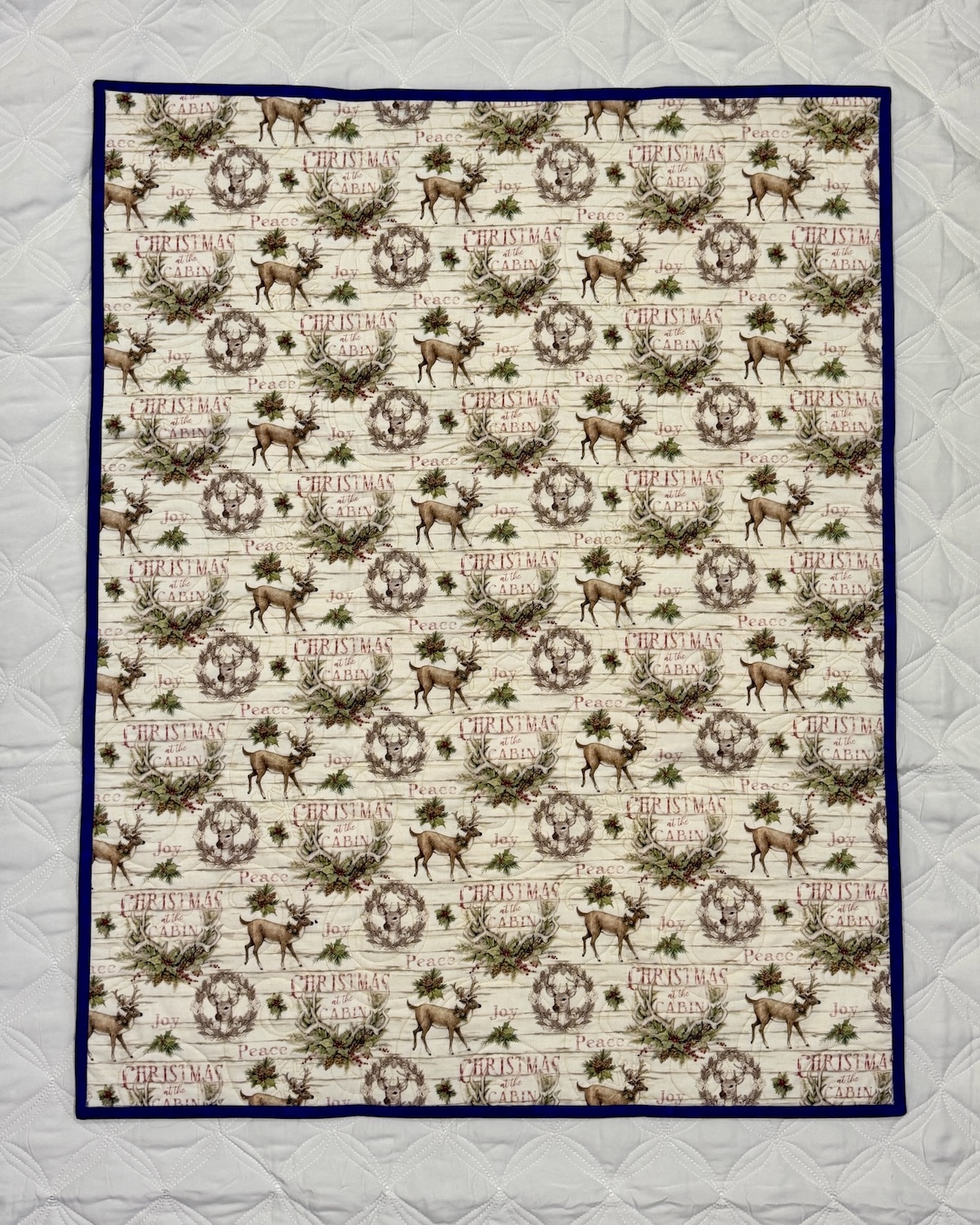 The Christmas Cabin Quilt brings classic holiday charm to life with a rich blend of red, green, gold, and blue fabrics arranged in a festive pinwheel pattern. The front sparkles with snowflake and ornament prints framed by deep green and royal blue borders for a cozy winter look. The back features a rustic holiday print with reindeer, wreaths, and the words “Christmas at the Cabin,” adding warmth and country charm to this handmade seasonal favorite.