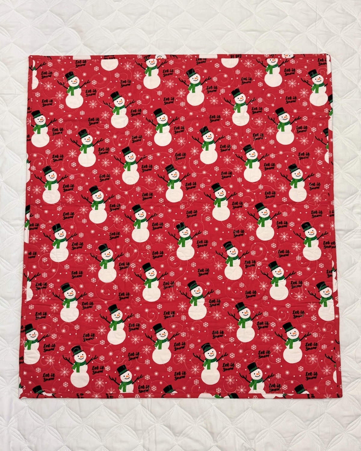 The Let It Snow Quilt captures the cozy charm of the holiday season with a festive mix of red, green, black, and white fabrics featuring cheerful snowmen, holly, and snowflakes. The patchwork front is framed with a bold red border that brings the design together beautifully. The back is made from matching red fabric covered in smiling snowmen and playful “Let it Snow” text, making this quilt a joyful and heartwarming addition to any winter decor.