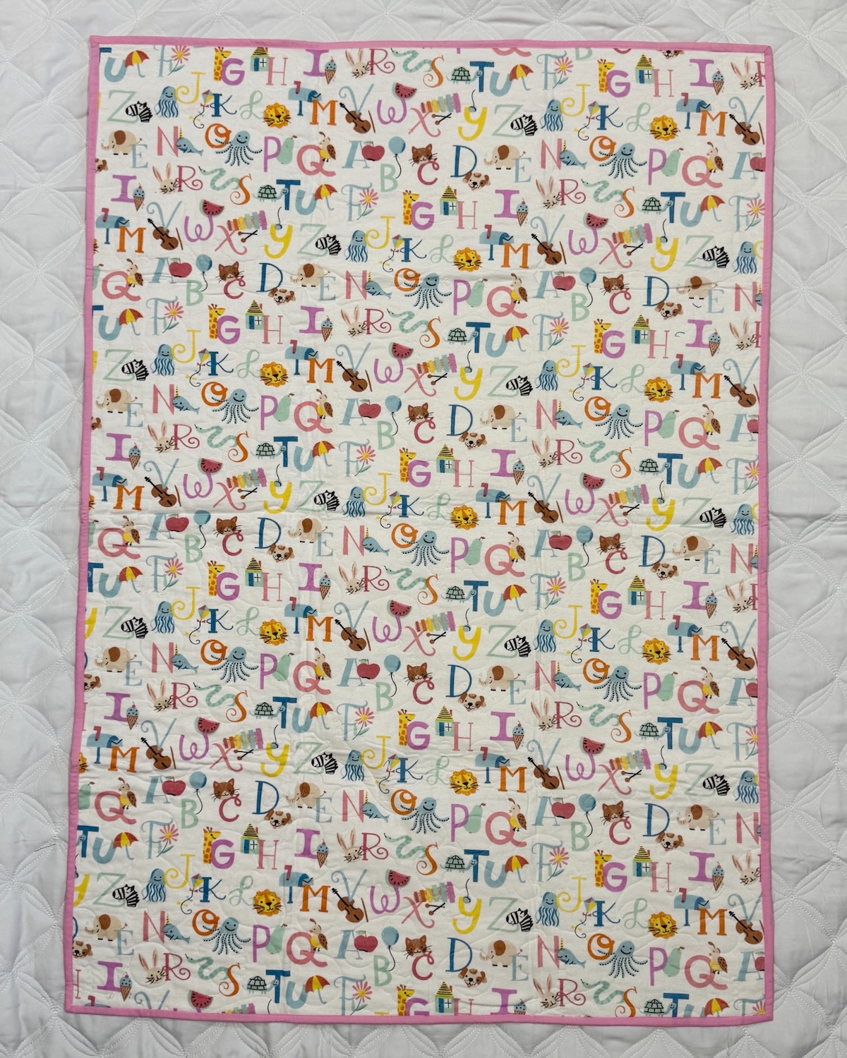 The Sunshine Dreams Quilt features a bright and cheerful mix of yellow, pink, and white fabrics arranged in a playful half-square triangle pattern. Framed with soft pink and golden borders, it captures the warmth of a sunny day with a sweet touch of whimsy. The back adds an extra layer of charm with an alphabet print filled with colorful letters and adorable little animals, making this quilt perfect for a nursery or as a cozy handmade gift.